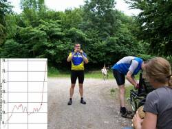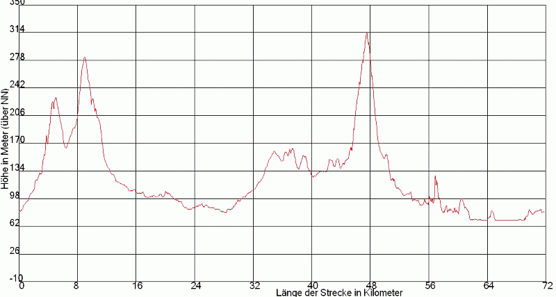 Hier das Höhenprofil von der kürzesten, aber besonders bergigen Route (Arno, Hinfahrt nach Elze und zurück):
