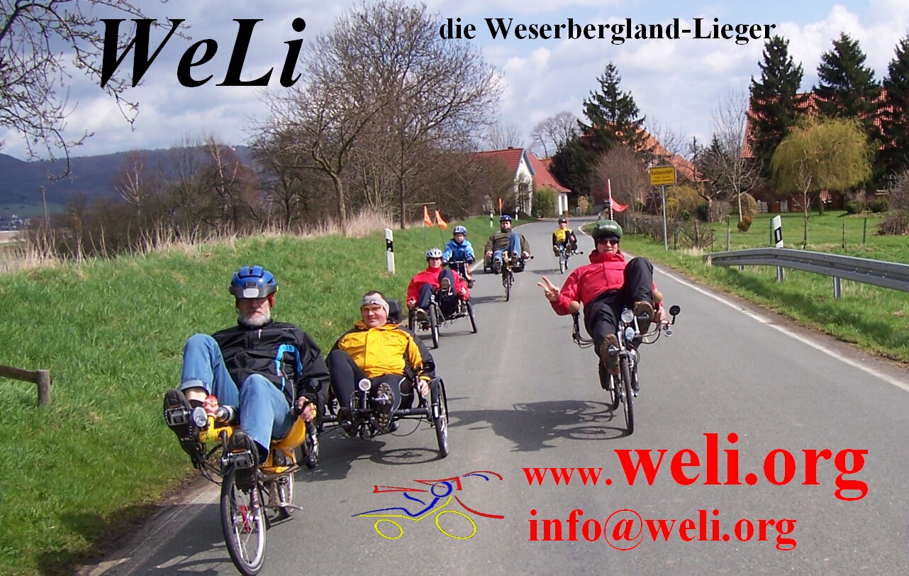 Wir über uns Die Bezeichnung WeLi ergibt sich aus unserem vollen Namen Weserbergland-Lieger. WeLi verbindet also alle interessierten Liegeradler aus dem Weserbergland und darüber hinaus. WeLi ist KEIN Verein, Club etc. Wir verzichten bewußt auf feste Strukturen, Zuständigkeiten, Hierarchie oder sonstige Einengungen. Jede Person mit Interesse am Thema Liegerad kann sich nach ihren individuellen Interessen zwanglos beteiligen. Sehr beliebt sind unsere regelmäßigen und gemütlichen Treffen (für Details bitte wenden), sowie die vielen gemeinsame Radtouren von gemütlich bis sportlich. Auch Touren mit anderen Radgruppen, Teilnahme an Liegeradrennen sowie Ausflüge zu Fahrradmessen und sonstigen Events gehören zu unseren Aktivitäten. Schaut doch einfach mal vorbei bzw. Fahrt mit! aktuelle Termine und weitere Infos beim Liegeradtreffen und: www.weli.org & info@weli.org Die Konstruktion und der Bau von Liege- und Lastenrädern wird von einigen unserer "Spezis" praktiziert. Wir sind auch bei Präsentationen von Liegerädern und anderen Sonderfahrzeugen zu finden. |