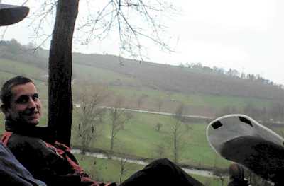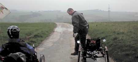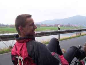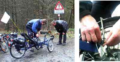 ![]() Im Wald vor einer steilen Gefällstrecke arbeitet Andreas an einer ausgefallenen Bremse. |