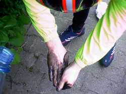 ![]() ... doch schon bald verklemmte sich Stefans Kette. Während die Tandemgruppe vorfuhr, blieben wir WeLi bei Stefan und begutachteten seine schmutzige Arbeit. |