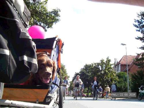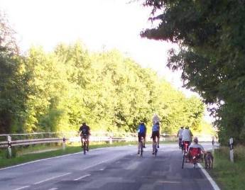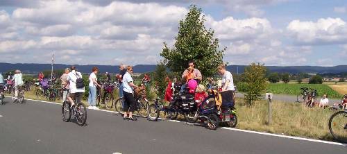 ![]() In Emmerthal gesellten sich noch Katja, Viktoria und Hund Sammy dazu (einmal ganz abgesehen von den vielen "normalen" Radfahrern auf der Strecke, sowie den Liegeradlern in Gegenrichtung). |
