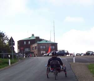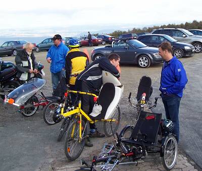 Lutz (rechts im Bild) trafen wir hier zufällig. Er hatte den Berg zuvor auch per Liegerad (Kettwiesel) erklommen. |