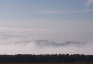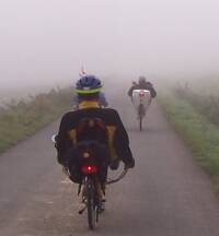 Martin entfernte sich jedoch zunächst vom "Monte Wau Wau", um der Liegeradgruppe entgegen zu radeln. Hierzu mußte er vorübergehend die sonnigen Höhen verlassen. Aus dem Tal krochen Ihm schon die Nebelschwaden entgegen.
