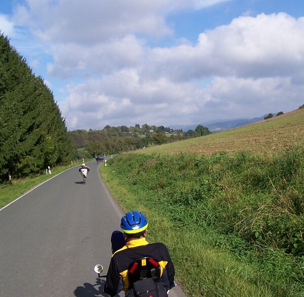 Nach einem letzten Blick in die Ferne, fuhren wir nun mit 6 Liegerädern talwärts Richtung Weser: |