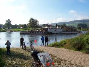 Seit einiger Zeit hat auch Grave eine kleine Fähre. (der kleine Punkt am anderen Flußufer - also nicht der Dampfer) |