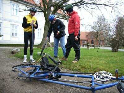 Nach einer langen Pause in Fischbeck wollten wir nun doch weiterfahren. Dann zeigten sich bei einem Schlauch die Folgen eines ungebetenen Druckausgleiches - man sagt dazu wohl "Platten". Wir blieben also weiterhin in Fischbeck .... Kenner der "Nightridertour 2005" werden sich bestimmt noch an grünen Sabber ("Pannenschutz";-) erinnern, der sich ungehemmt aus einem bestimmten platten Reifen ergoß. Aktueller Hinweis: Diesmal war der Sabber weiß! ;-) |